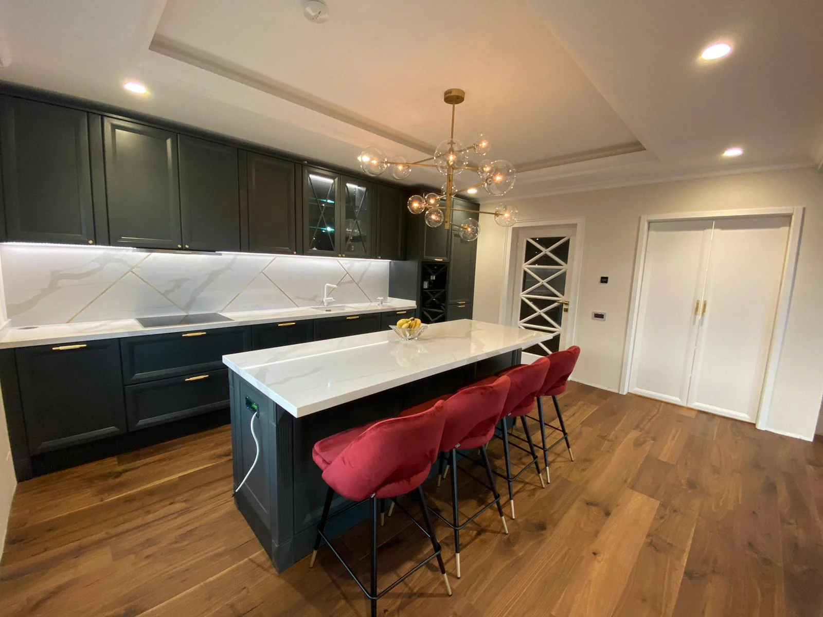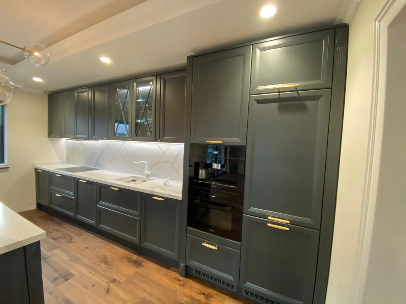• Placare perete – realizată din același quartz, în care au fost inserate elegant lamele din alamă aurită.