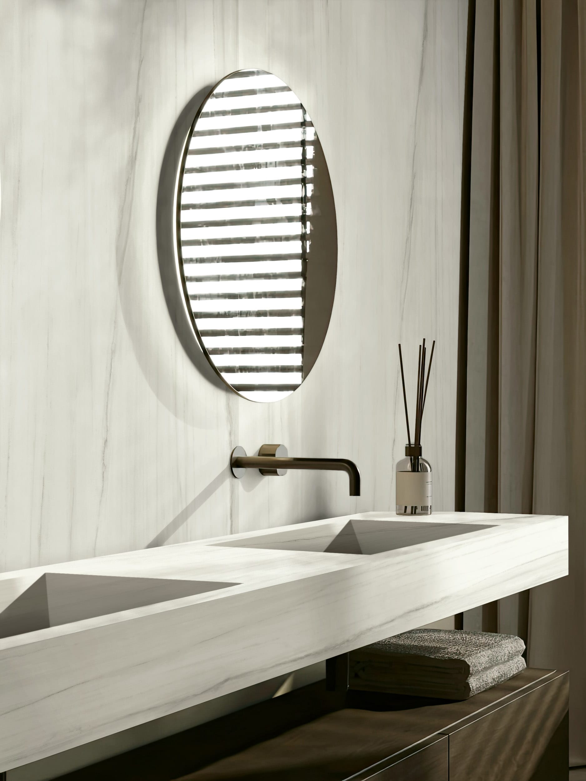 Blaturile fabricate pe comandă din ceramică Dolomite impresionează printr-o estetică luminoasă, echilibrată și rafinată, inspirată de reinterpretarea contemporană a marmurei albe.