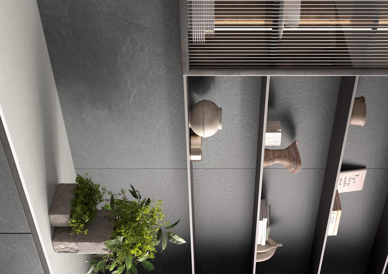 Vulcano Laminam, o nuanta cu fondul suprafetei in tonuri accentuate de negru, transmite un apel textural, un impact vizual și un caracter îndrăzneț, imbogatind spațiile elegante si transformându-le în oaze de liniște. Suprafața sa structurata, bogată în pete și vene, surprinde forța și vigoarea pietrei de ardezie neagra care a fost sursa inspiratiei sale.